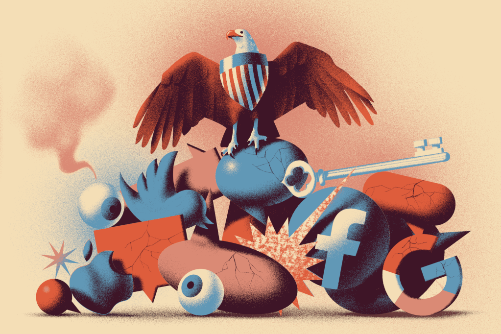 Illustration for an article about the mistrust between U.S. Politicians/Government and Big Tech, that many trace to the 2016 election, but actually began earlier with the Snowden leak / NSA spying revelations.