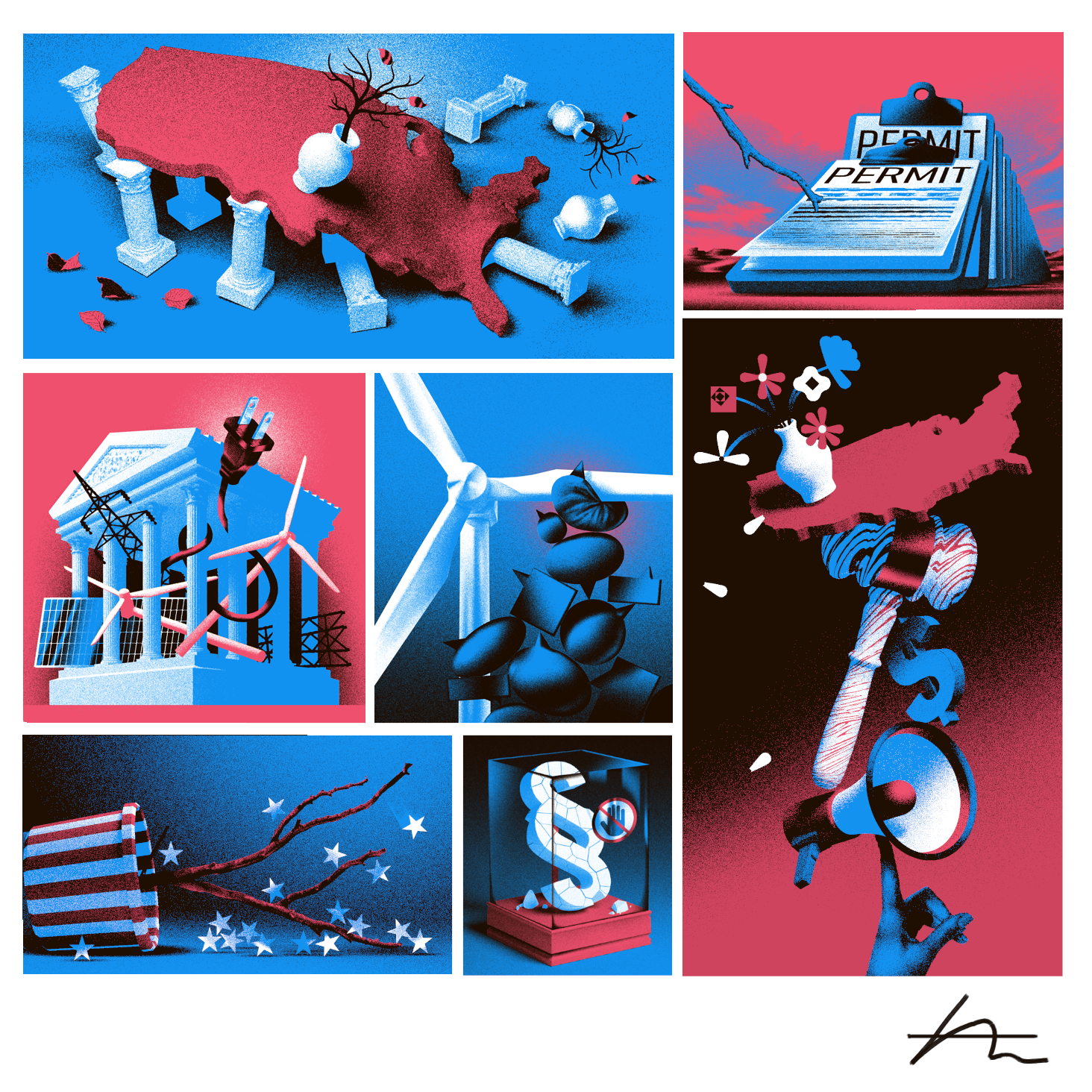 Unused set of 6 illustrations for an Insider article about the need for huge infrastructural changes within the US.